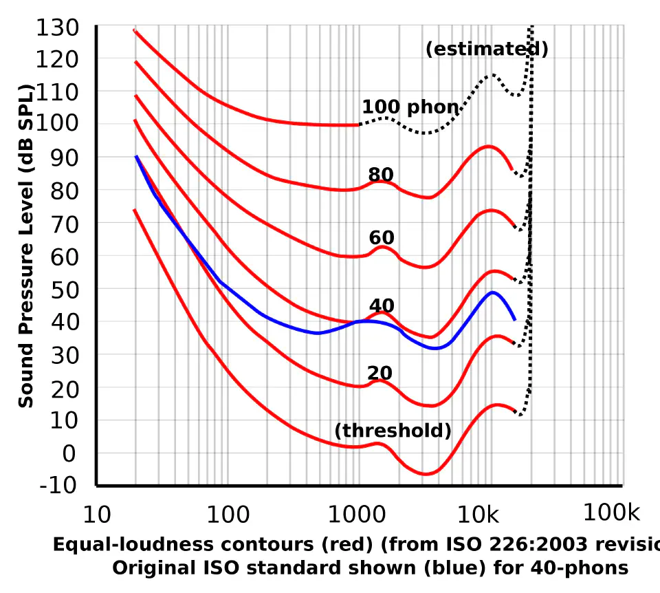 人間は同じ音圧エネルギーでも周波数によって聞こえる音の大きさが変わるという特徴がある。次の画像は東ラウドネス曲線と呼ばれるもので、どのくらいの音圧が同じ音量に聞こえるかを周波数ごとにプロットしたものである。