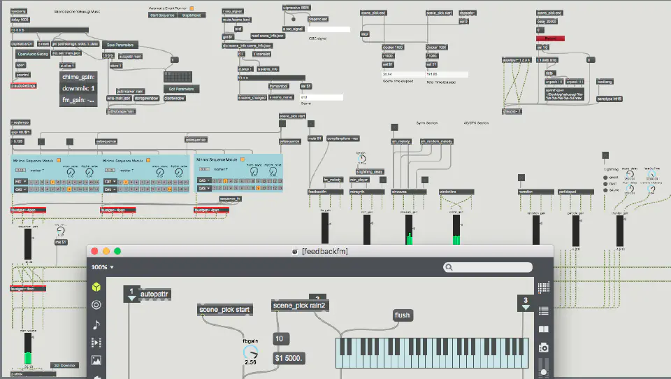 ↑が実際に使ったCycling'74 Maxのプログラムの画面です。この中で更にFaustという別の言語を使用し1、シンセサイザーやエフェクターのアルゴリズムをフルスクラッチで書くみたいなことを作曲の一要素としてやっています。グラフィックス側の情報をUnity側からOSCで送ってもらってリアルタイムに変化させている部分もあります。