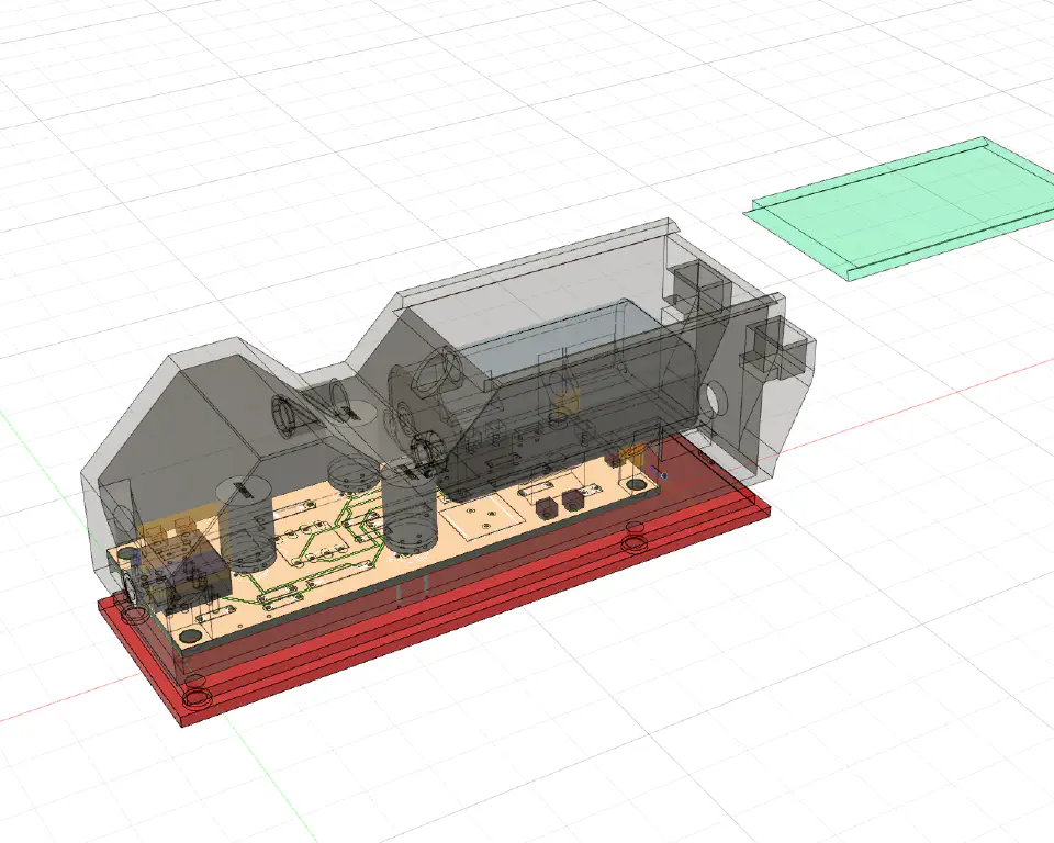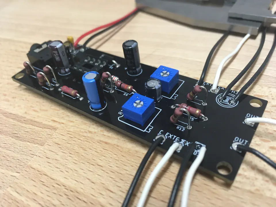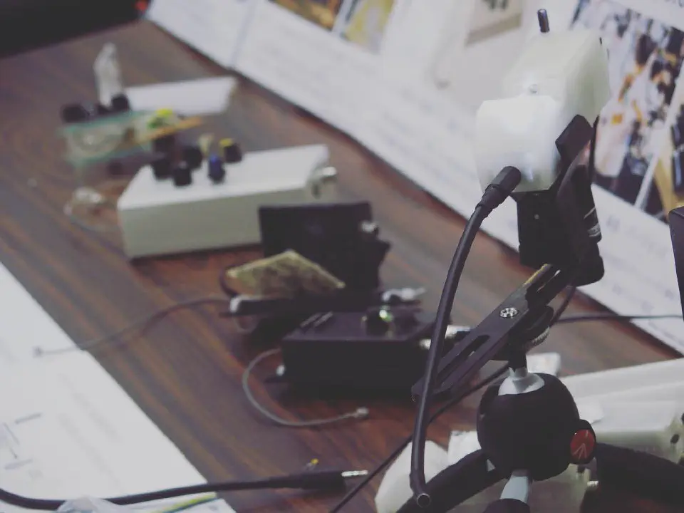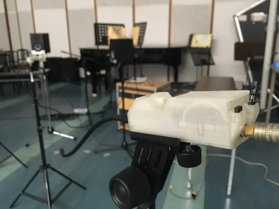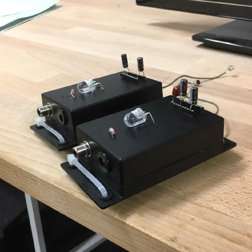 5月までのパフォーマンスを顧みて、6月後半に新しく作り直したもの。変更点としては、つまみを外側ではなく2つだけケースの内側に調整用に残し、基本的な演奏はマイクとスピーカーの位置や共鳴度合い、ケース外側に出したLEDと光センサを直接手で触る、及びソケットに挿すコンデンサの容量で調整する形になった。また、内部の回路的には電源を±で供給することでも回路が煩雑になっていたので、5Vの単電源で動くようにした。ケースは汎用のプラケースに穴を空けていて、基板はパーツ数が減ったこともあり、ユニバーサル基板に手で実装している。2018年8月の水道橋Ftarriでのパフォーマンスのセットアップ。一台は画像内のスピーカーに直接繋ぎ、もう一台は会場のPAにつないでいる。2018年12月の《FREQ x HardCcreAmbience》でのパフォーマンスのセットアップ。新しく作ったモデルを3つ、黒い旧型を2つの合計5台をそれぞれ1つのスピーカーに繋いで、会場全体から音を鳴らすパフォーマンスを行った。回路自体はほぼ同じままレイアウトをスリムにしたプリント基板を発注し、3Dプリンタでボディを再設計した。電源はコネクタを排し、9V電池を中に入れて動かすことで取り回しを良くしている(内部的には5Vで稼働している)。直付けになっていたマイクロフォンはステレオミニコネクタの端子を付け、同時に電源スイッチとしても働くようになっている。At Maker Faire Kyoto 2019