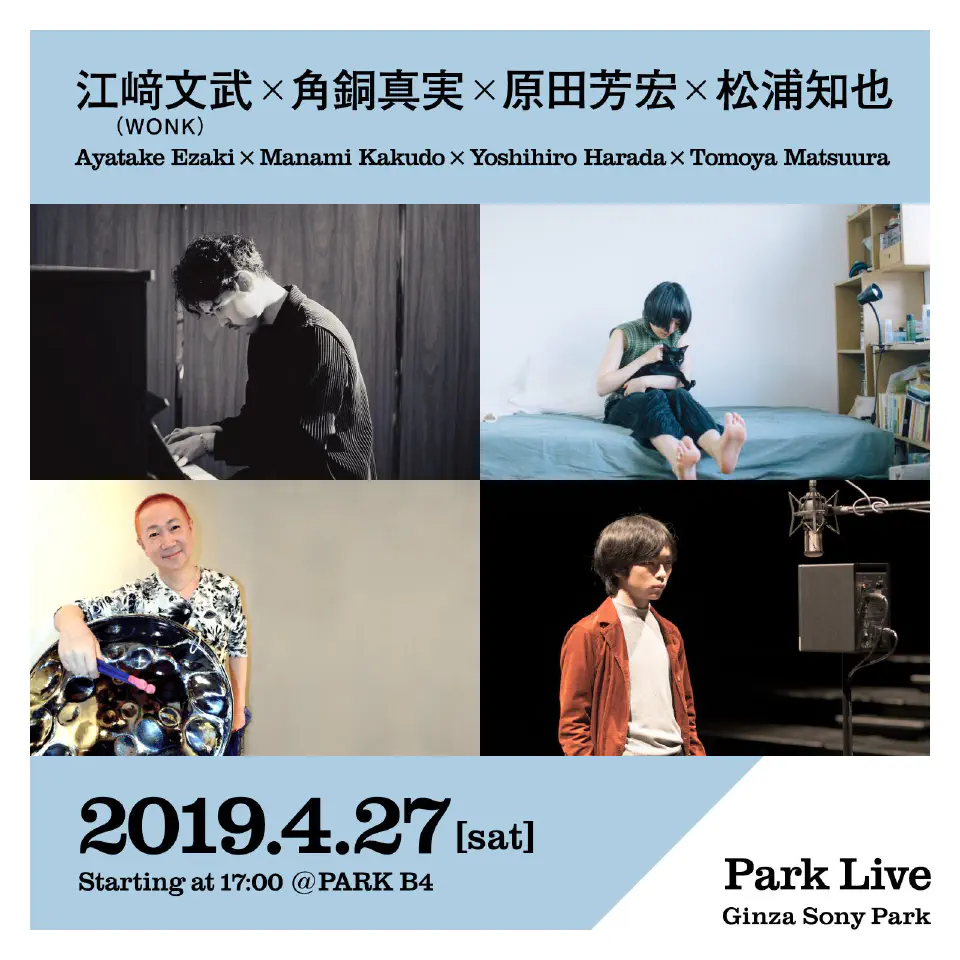 2019年4月27日(土)17:00〜にGinza Sony Park地下4階で行われるPark Liveにて、江﨑文武(WONK)×角銅真実(cero)×原田芳宏×松浦知也での即興セッションを行います。入場は1ドリンクのみ、予約不要です。お気軽にお越しください!