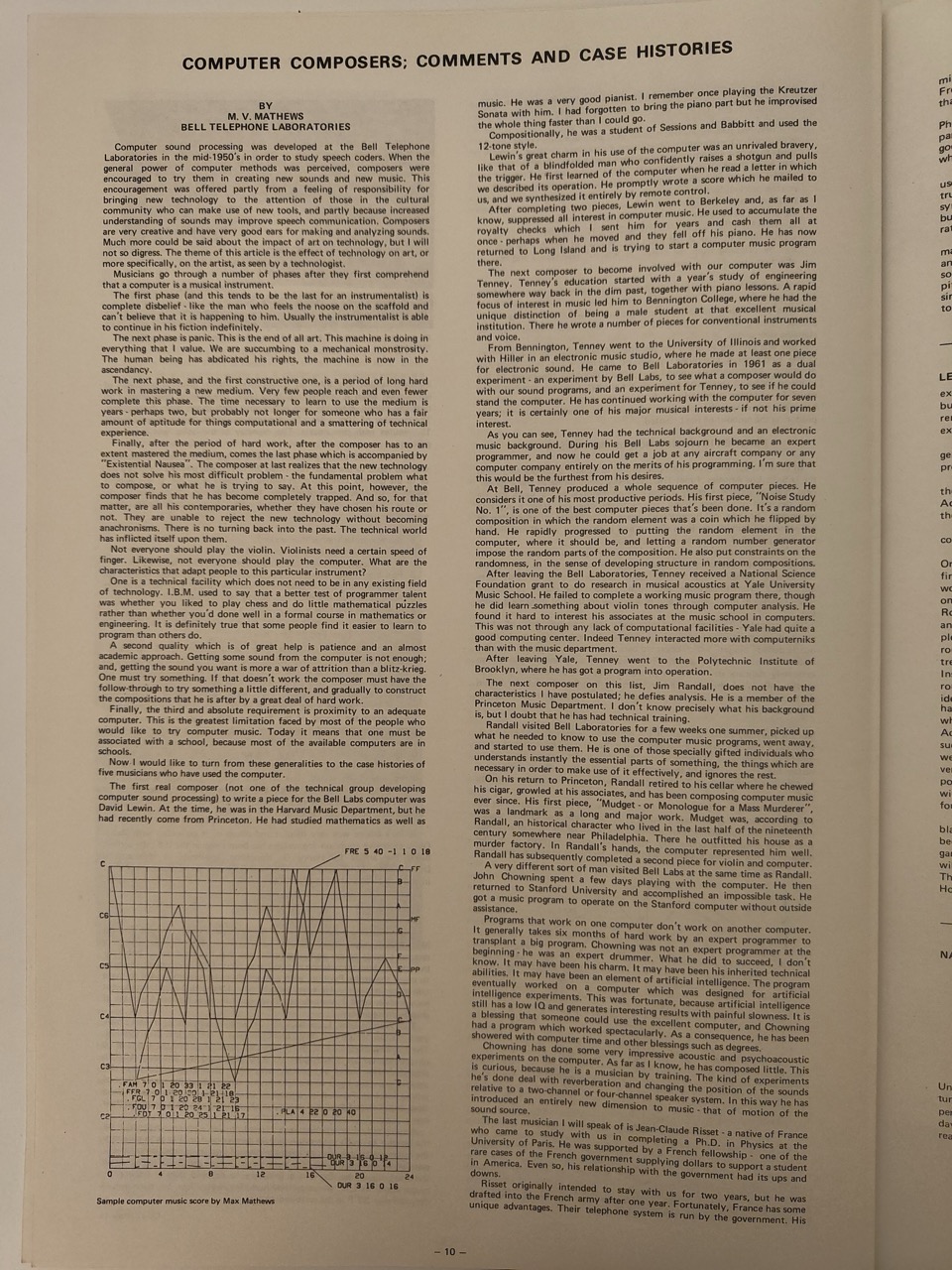 この文章は、Max V. Mathewsによる「Computer Composers: Comments and Case Histories」(1970)の翻訳である。この文章は、ベル研究所のビリー・クルーヴァーと美術家のロバート・ラウシェンバーグを中心に組織された非営利団体、芸術と技術の実験(Experiments in Art and Technology:E.A.T.)の発行していたジャーナル「Techne」2号に掲載されたものである(E.A.T.は何度か名前を変えてジャーナルを発行しており、TECHNEは後期のもの)。