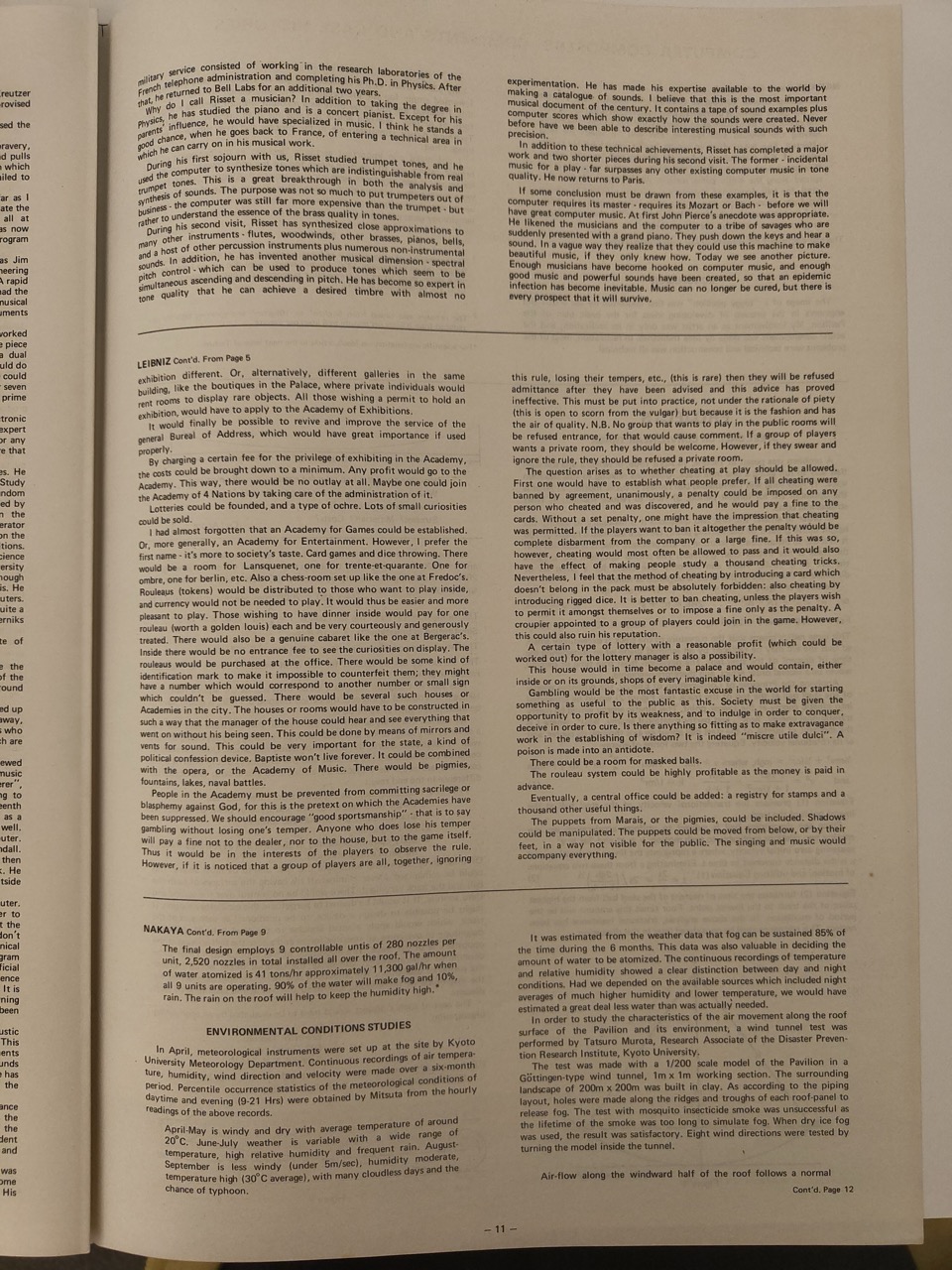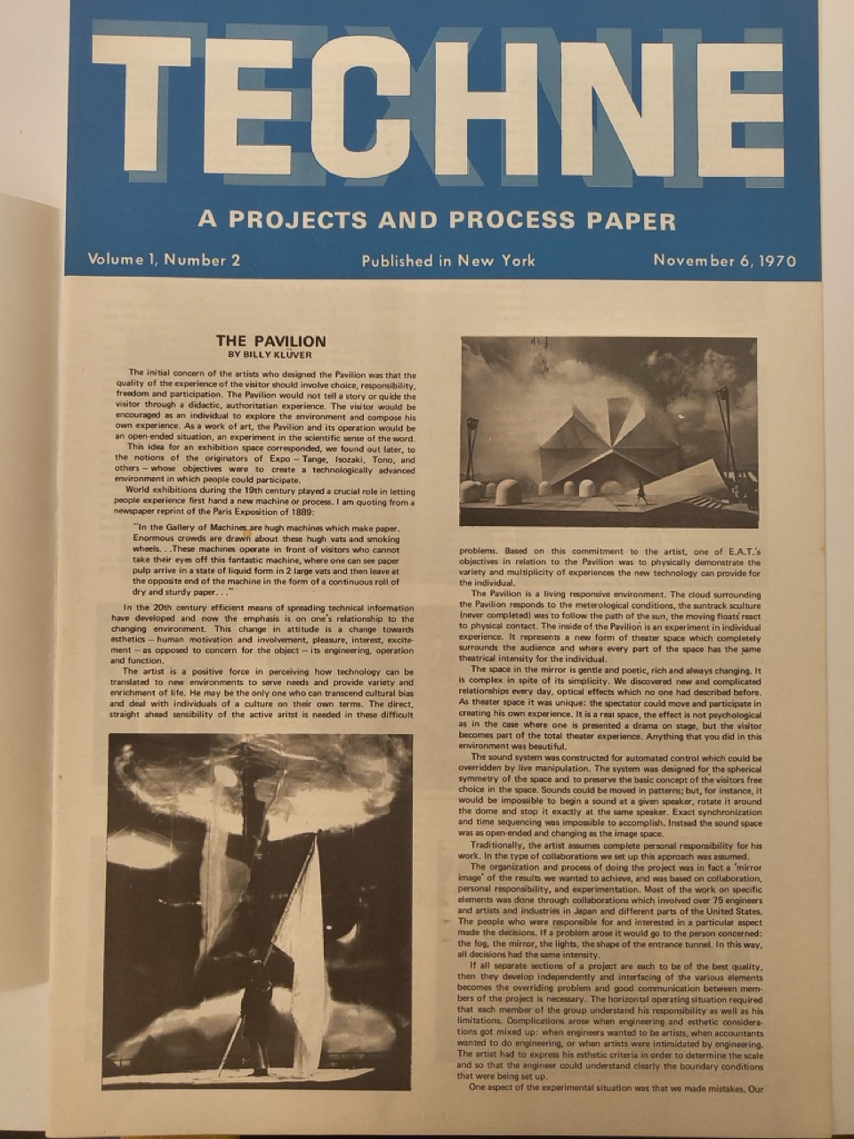 マシューズは一般にベル研究所で世界で最初のPCMベースの音声合成プログラム「MUSIC」を開発するなど、コンピューター音楽研究の始祖として知られている人物だ。あまり知られていないことだがマシューズはE.A.T.を構成するエンジニアメンバーの1人として名を連ねている。マシューズとE.A.T.の関わりは実際そこまで多くはなく、E.A.T.創立当初に、中心メンバーであったクルーヴァー、ラウシェンバーグ、ジョン・ピアースに並んで行動理念を示す文章を寄せていること1、アーティストに向けた技術レクチャーシリーズでコンピューター音楽のレクチャーを行なっていること、そしてこのTECHNEに寄せた論考の3つである(それ以降は活動の拠点がスタンフォード大やIRCAMなどに移ったこともあるのだろう)。