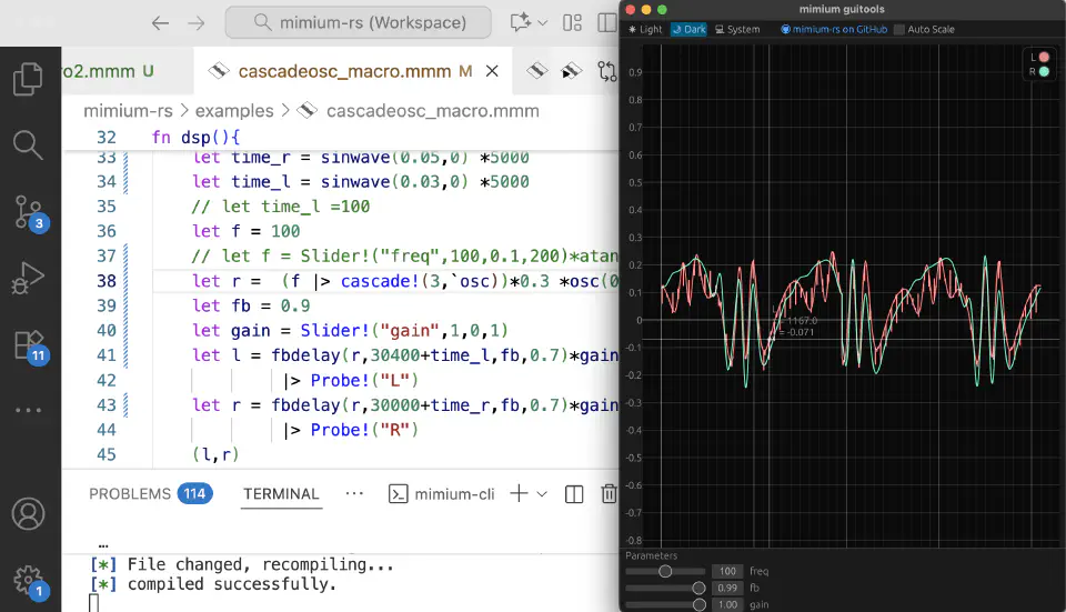 またmimiumは独自のライブコーディング機能をもち、強い静的解析と差分処理を行うことで、信号処理のうちどの部分を変更したとしても、音が途切れることなく演奏を続けることができる。