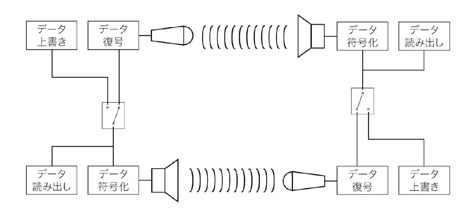 装置を完全に分離した場合、自分で出した音を相手の音と混ぜて聞いてしまうということが発生する。これはラジオの要領でデータをお互い違う周波数に変調して送信、受信して復調というようにすれば解決できる。