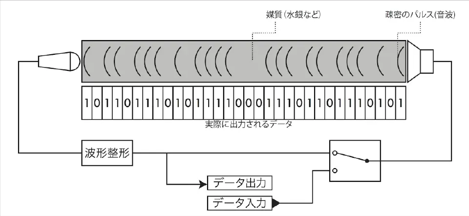 エッカート: 例えば、水銀で満たされたタンクがあるとしよう。1000発のパルス音を片方の端から入れて、反対側の端から漏れ出てしまう前までは、それはメモリーと呼べるだろう。 問題は1ミリ秒後のことだ。もしパルスが1マイクロ秒ごとに一つづつタンクから出ていってしまえば、それでお終いだ。しかしここでこのパルスを毎回取り出して、もう一度元の形に整形してもう一度戻したとしたらどうだろう。パルスは言ったとおりに循環し続け同じ状態を保つ。